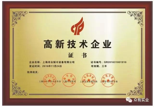 獲得高新技術企業認證,證明了非眾制冷在本領域中具有較強的技術創新能力、高端技術開發能力。