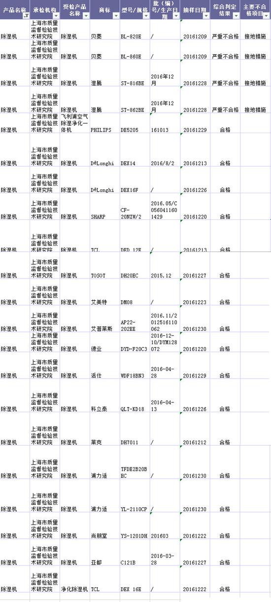 本次抽查的除濕機品牌包括貝菱、濕騰、PHILIPS、DēLonghi、SHARP、TCL、TOSOT、艾美特、艾普萊斯、德業、活仕、萊克、科立泰、尚朋堂、浦力適和亞都等21批次產品,其中,貝菱和濕騰旗下的兩款除濕機在抽查中檢測發現產品嚴重不合格,主要不合格項目為接地措施。