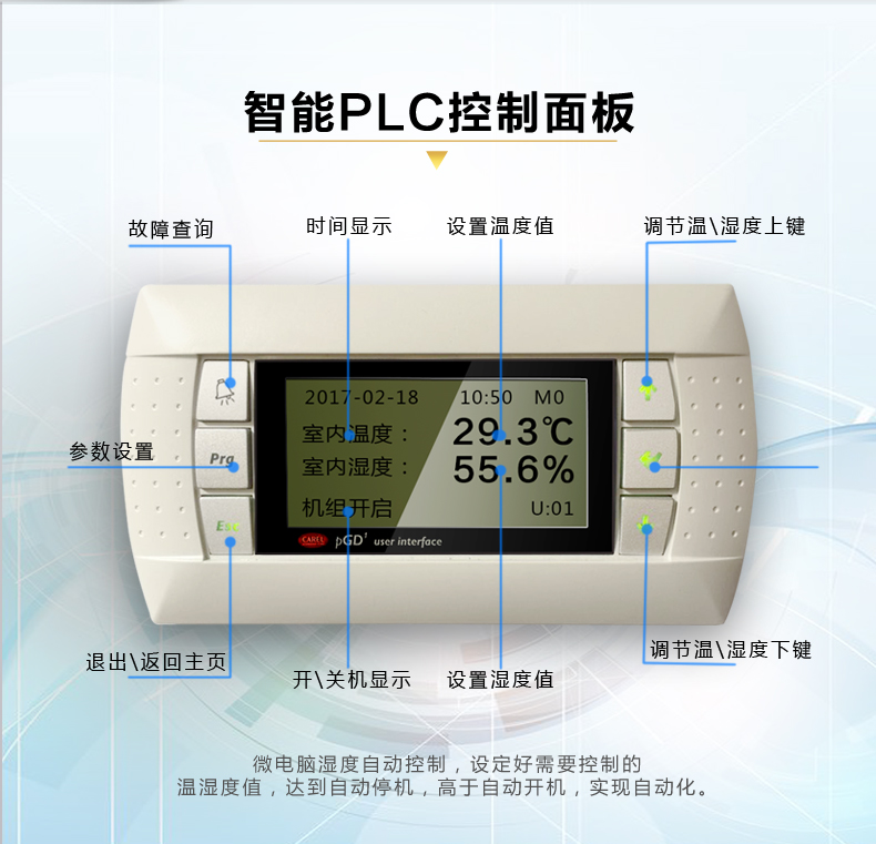 3、高性能電子電極加濕器:不滋生細(xì)菌,對(duì)室內(nèi)空氣無(wú)污染;對(duì)水質(zhì)無(wú)特殊要求,無(wú)需水處理;獨(dú)立加濕器控制板,自動(dòng)定時(shí)換水清洗,延長(zhǎng)使用壽命,能自動(dòng)根據(jù)加濕要求控制水位及加濕電極電流,實(shí)現(xiàn)高精度控制,真正滿足高精度要求;
